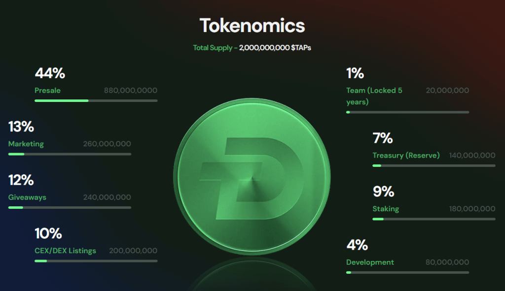 Tokenomics são bem projetados. O suprimento total é limitado a 2 bilhões de tokens $TAP. A alocação é estruturada com 44% dedicada à pré-venda, 9% ao staking, 12% aos sorteios, 13% ao marketing, 10% a listagens CEX/DEX, 7% a reservas do tesouro, 4% ao desenvolvimento, e apenas 1% reservado para a equipe, bloqueado por cinco anos.
