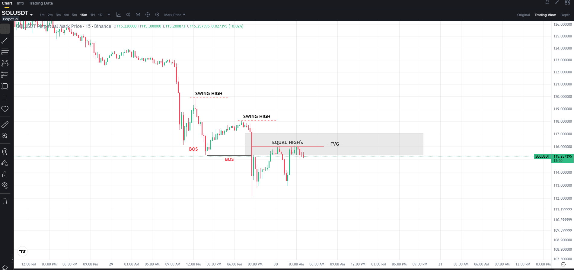 Como podemos ver no período de 15 minutos que o preço está em tendência de baixa, seguindo uma tendência de queda. Também podemos ver a quebra de estrutura e eu também marquei no gráfico abaixo. Na última parte do preço, você pode ver facilmente que o preço criou Alturas Iguais, o que significa que há liquidez descansando acima. Portanto, se o preço precisar cair, deve captar essa liquidez para cair visando a próxima zona de liquidez. Para isso, uma Consolidação precisa ocorrer para criar mais liquidez. Assim, pode cair facilmente, mas lembre-se de que antes da queda o preço pode criar um cenário de alta para enganar todos vocês. Mas evitem entrar em Long.