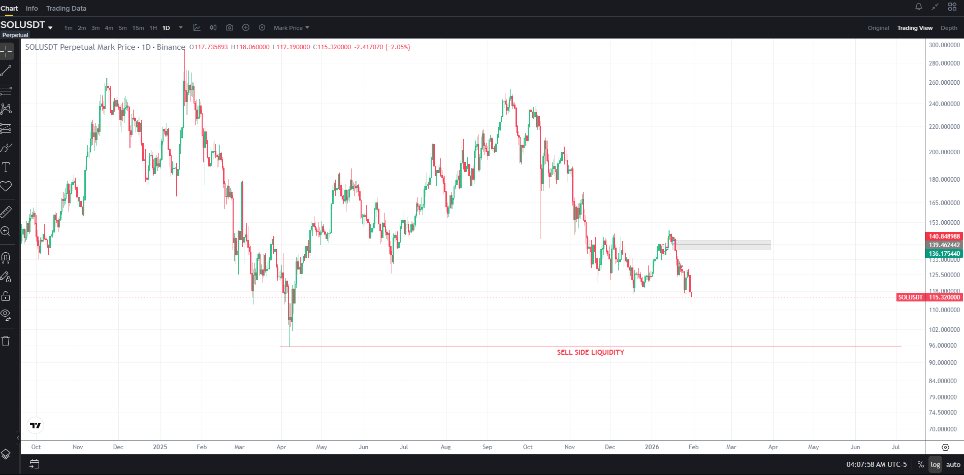 Como podemos ver no gráfico que no período diário, a SOLANA ainda está em tendência de baixa. Talvez haja uma pequena correção / recuo. Mas eventualmente o preço da SOLANA terá que cair para captar liquidez. Todos sabemos que o preço segue a liquidez. Eu fui bearish na SOLANA desde 30 de setembro de 2025 e ainda estou bearish até hoje. Então, sem captar essa forte liquidez lá embaixo, não irei entrar em posição longa até que haja um movimento claro e fresco de volta.