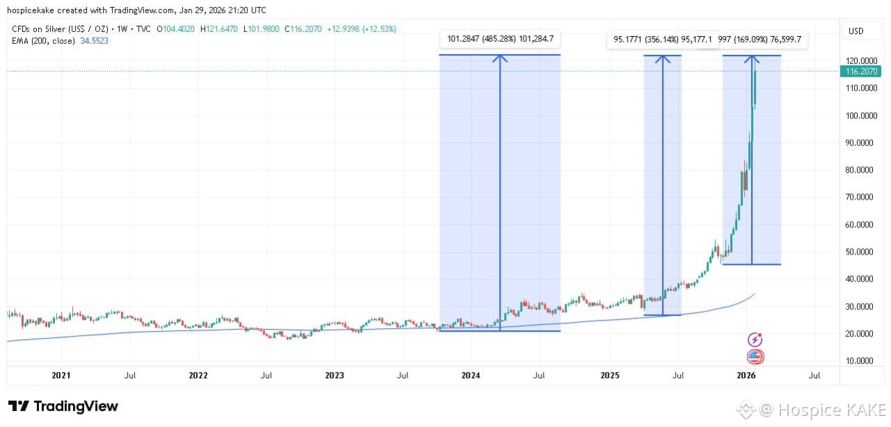 L’argent (Silver), souvent sous-estimé, affiche des chiffres encore plus spectaculaires : +485 % depuis 2024, +356 % depuis 2025, et +169 % sur les trois derniers mois.