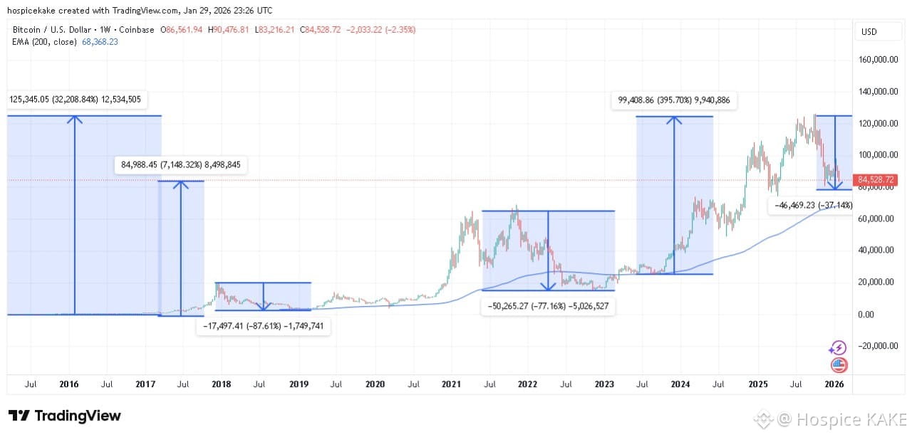 Entre 2015 et 2025, au niveau de prix actuel, le Bitcoin affiche plus de +7000 % de performance cumulée. Un chiffre qui n’a été possible qu’au prix d’une discipline extrême : -87 % de correction en 2019 et -77 % en 2022, périodes durant lesquelles il fallait ne pas vendre pour bénéficier du cycle complet.