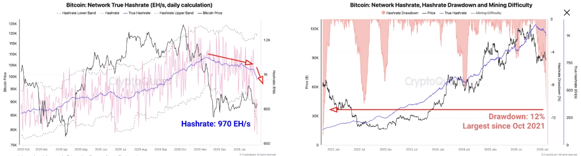 Grandes tempestades de inverno nos EUA levaram operações de mineração a cortar sua atividade, e desde a queda, a taxa de hash da rede caiu drasticamente, sendo a maior queda desde 2021. Uma taxa de hash mais baixa significa estresse na receita dos mineradores, e mineradores estressados às vezes vendem BTC para cobrir custos, um processo que é apenas uma má notícia em tempos de fraqueza do mercado.