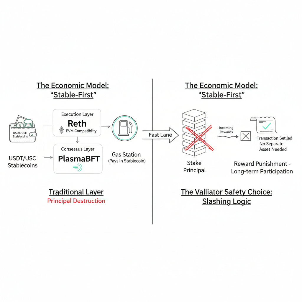 Plasma se baseia em uma pilha EVM moderna e em uma camada de consenso focada em desempenho. Na execução, é construído em torno do Reth, que mantém a compatibilidade com ferramentas e contratos no estilo Ethereum. No consenso, o PlasmaBFT é projetado para finalidades de baixa latência, o tipo que você realmente deseja quando a expectativa do usuário é que um pagamento deve ser liquidado rapidamente e de forma previsível. O modelo de validador também inclui uma escolha de segurança incomum: enfatiza a punição de recompensas em vez de punição de participação, visando punir comportamentos inadequados sem introduzir as mesmas dinâmicas de destruição de princípios que você vê em outros lugares. Isso é um sinal deliberado de que o Plasma está pensando na participação de validadores a longo prazo em um ambiente de pagamentos.