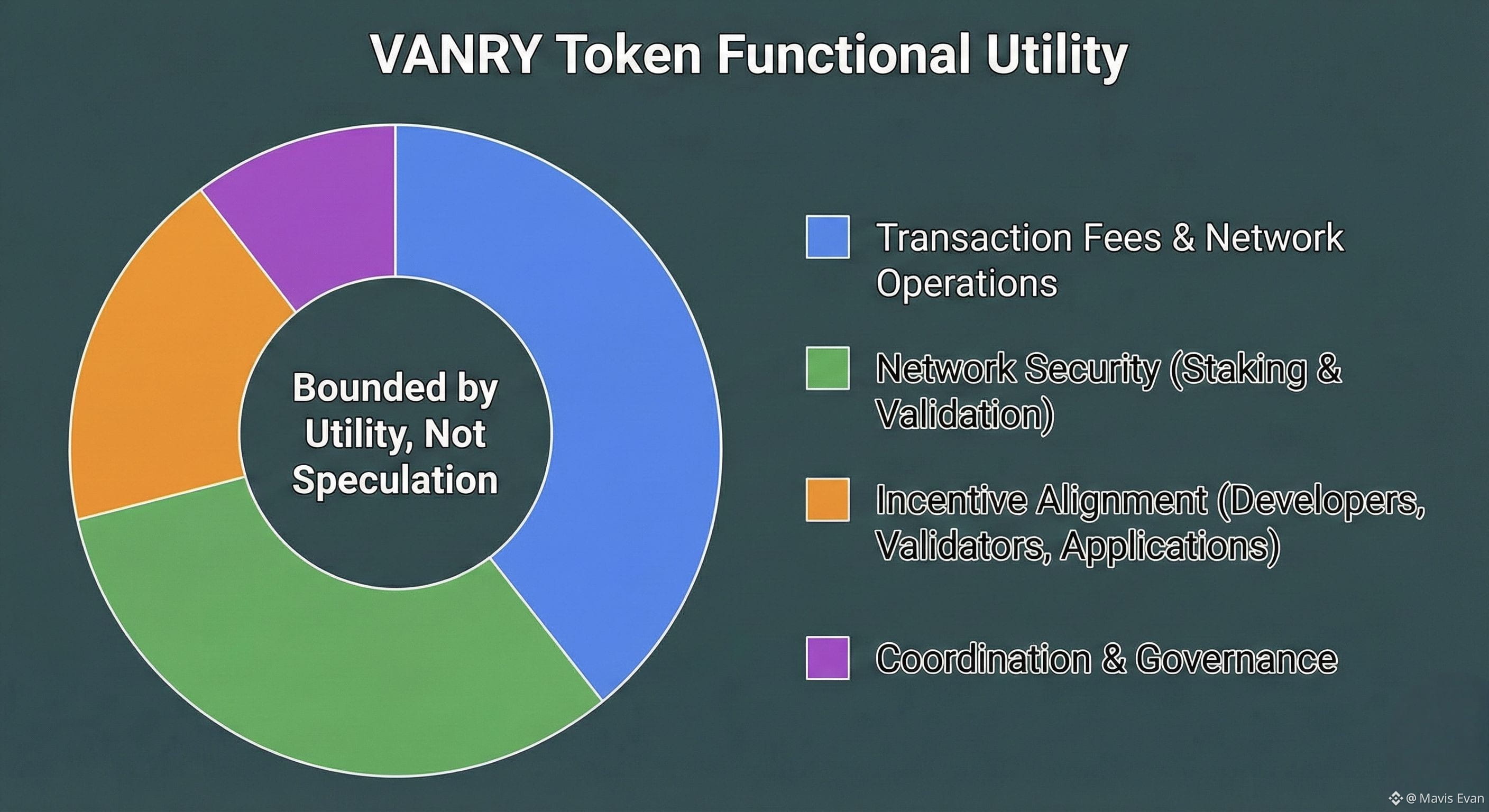 The VANRY token plays a functional role within this system rather than serving as a speculative instrument. It is used for transaction fees, network security, and coordination between participants who maintain and build on the network. Its purpose is to align incentives between validators, developers, and applications, ensuring that the network remains operational and economically sustainable. Importantly, its role is bounded by utility. It exists to support behavior on the network, not to define the network’s value proposition.