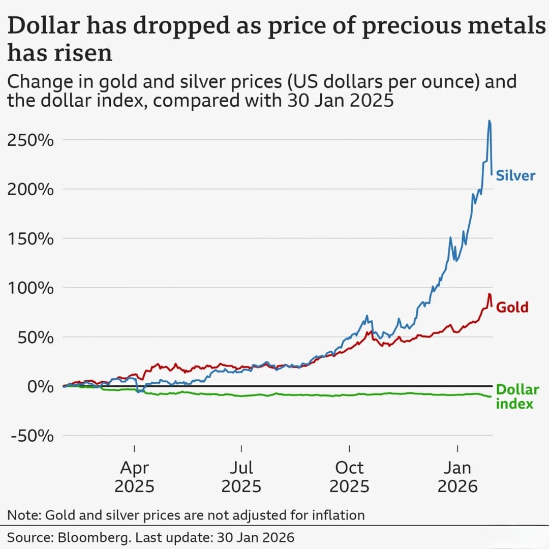 As ameaças de Trump em relação à Groenlândia aumentaram as tensões políticas globais e levaram a uma queda acentuada na confiança no dólar americano, com os investidores recorrendo a metais preciosos como um investimento mais seguro. O maior golpe sofrido pelo dólar durante o mandato de Trump ocorreu após as chamadas tarifas do "Dia da Libertação", anunciadas na primavera passada.