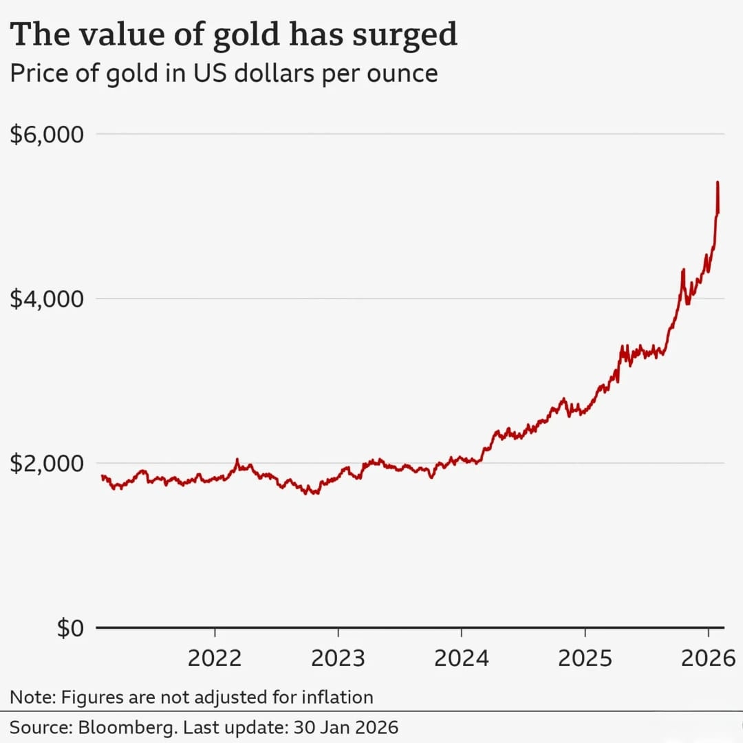 Um gráfico de linhas mostrando o preço do ouro em dólares americanos por onça, de fevereiro de 2021 a janeiro de 2026. Ao longo do período, o preço do ouro subiu de cerca de US$ 1.861, atingindo um pico de US$ 5.417 em 28 de janeiro de 2026, antes de se estabilizar novamente em US$ 5.417 em 30 de janeiro. A fonte é a Bloomberg.