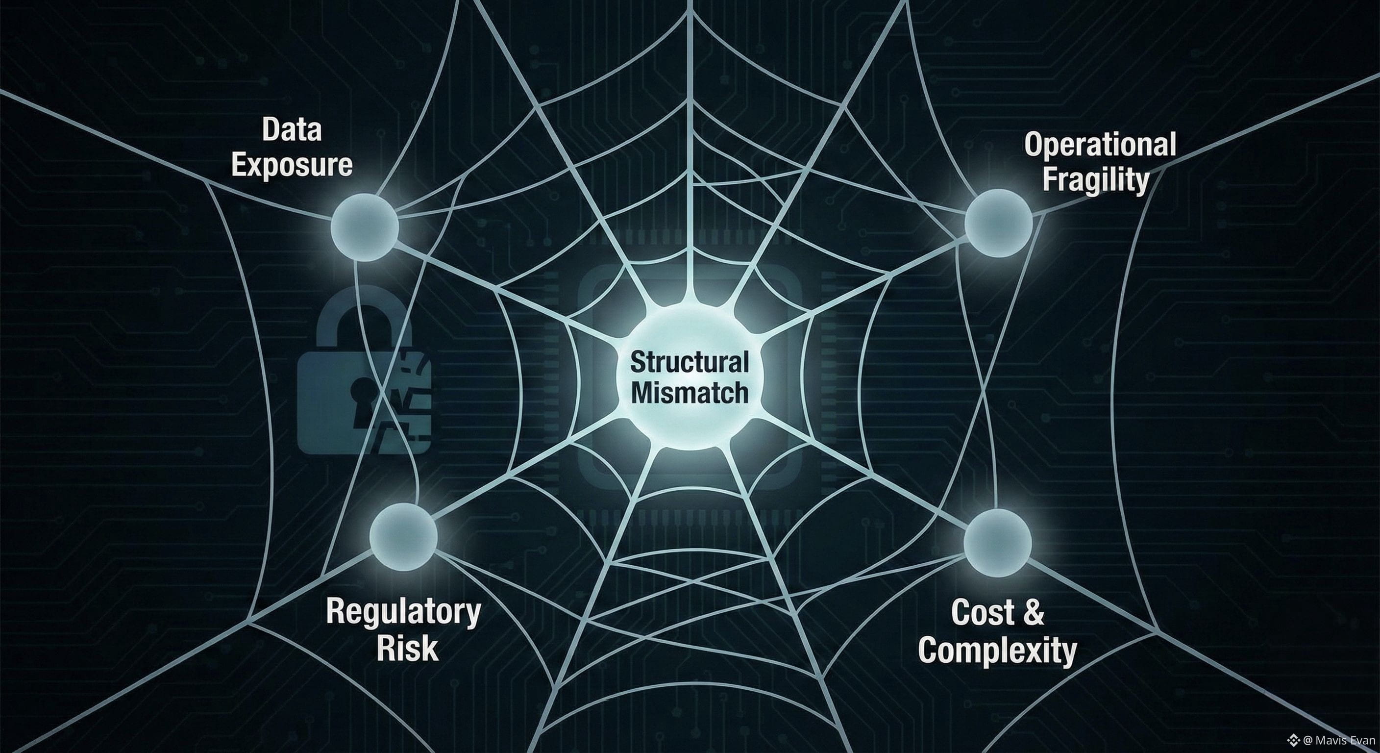 This gap is not theoretical. Asset managers handling private placements, funds coordinating internal governance, or enterprises storing proprietary datasets cannot rely on systems where every interaction is globally visible and permanently indexed. Attempts to patch this problem have often fallen short. Layered privacy tools are frequently bolted on after the fact, creating complexity and operational fragility. Centralized storage solutions, even when paired with blockchain settlement, reintroduce trusted points of failure and censorship risk. The result is an ecosystem where decentralization exists in principle, but practical usage remains constrained by off-chain dependencies and legal exposure.