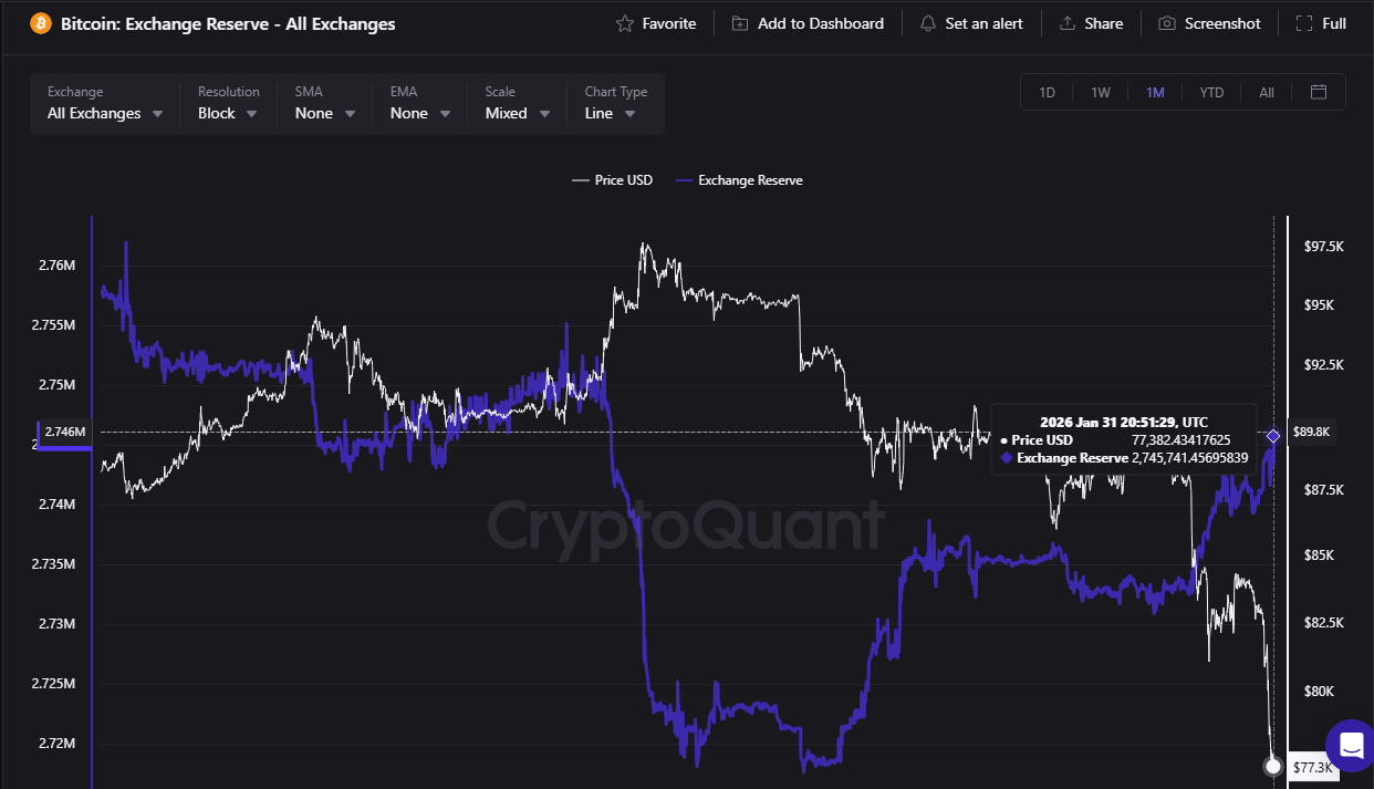 Esse comportamento é refletido em métricas-chave na blockchain. O STH-SOPR confirma que os investidores de curto prazo estão realizando perdas, uma característica definidora da capitulação. Ao mesmo tempo, o aumento das reservas de Bitcoin nas exchanges (CEX) aponta para uma crescente intenção de venda, à medida que o BTC é transferido de carteiras privadas para plataformas de negociação.