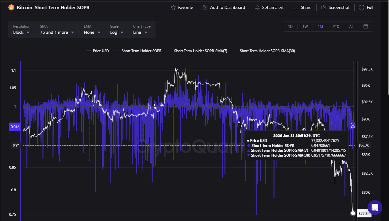 A atual queda de preços — uma característica definidora dos mercados em baixa — leva a uma deterioração na lucratividade, particularmente entre os investidores de curto prazo conhecidos como Short-Term Holders (STH). Este grupo normalmente mantém um preço médio de entrada mais alto e, à medida que o mercado continua a cair, é gradualmente forçado a vender com prejuízo, aumentando a pressão de venda do lado à vista.