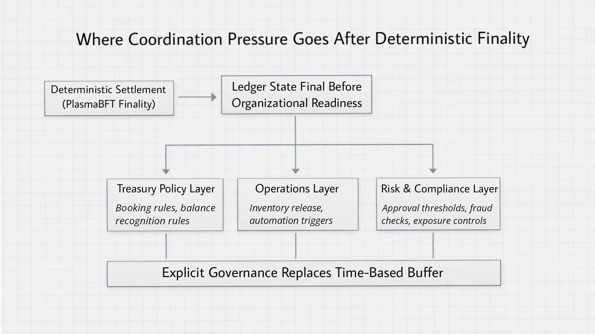 Quando a liquidação se torna determinística, como em sistemas de finalização sub-segundo como PlasmaBFT, aquele espaço de coordenação colapsa. O livro razão se fecha de forma decisiva e precoce. Da perspectiva da cadeia, a transação está concluída. Não há mais zona indefinida onde os sistemas podem fingir que a incerteza ainda existe. O estado é final, esteja a organização pronta ou não.