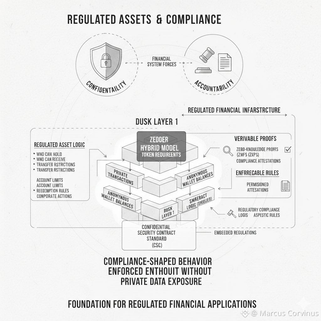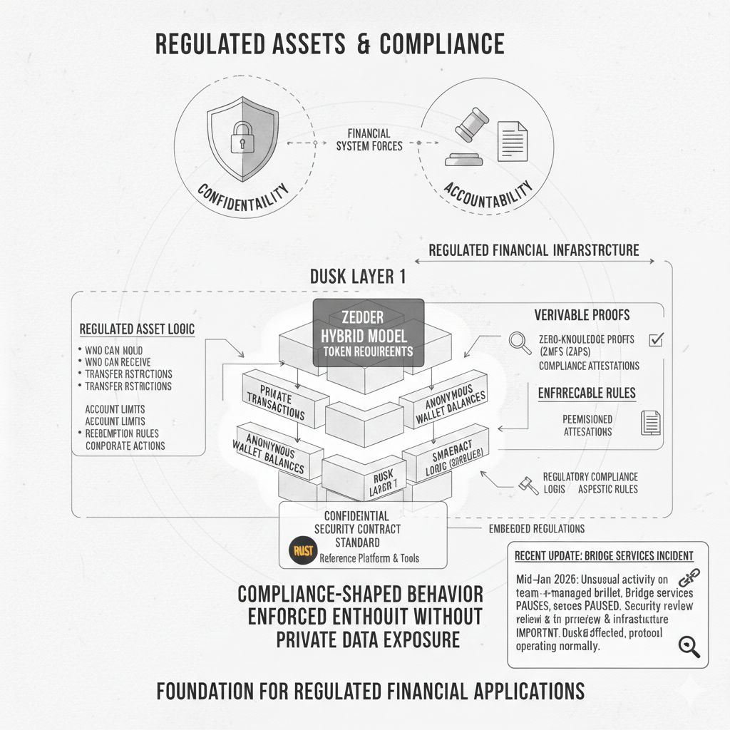 But the more interesting part is what comes next. Pure privacy systems often struggle the moment you introduce regulated asset logic. Regulated assets aren’t just “send from A to B.” They come with conditions — who can hold, who can receive, what restrictions apply, whether one person can create multiple accounts to bypass limits, how redemptions work, and how corporate actions or reporting can be produced. Dusk addresses that with Zedger, described as a hybrid model designed specifically for security-token requirements while preserving privacy, and positioned to support the Confidential Security Contract standard.