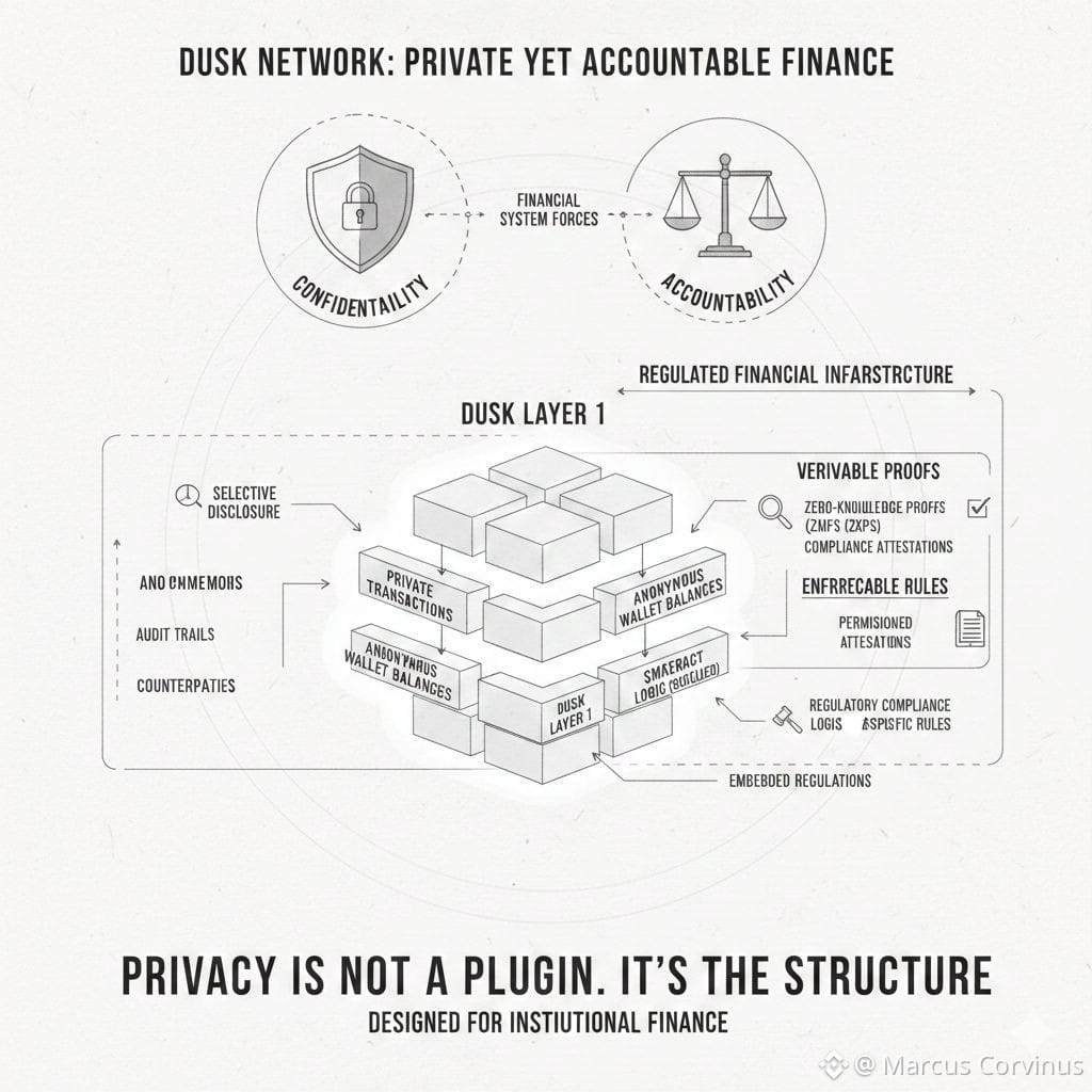 The reason this matters is simple: finance runs on two forces at the same time. Confidentiality protects counterparties, strategies, and sensitive positions. Accountability makes sure the system can be audited, regulated, and trusted. Public chains usually force a trade-off between those two. Dusk’s thesis is that you shouldn’t have to choose, and that a chain can be designed so private activity is normal, while verifiable proofs and enforceable rules still exist when the asset demands them. This is exactly the direction Dusk frames in its own documentation, where the system is presented as regulated financial infrastructure rather than a general-purpose “privacy coin narrative.”