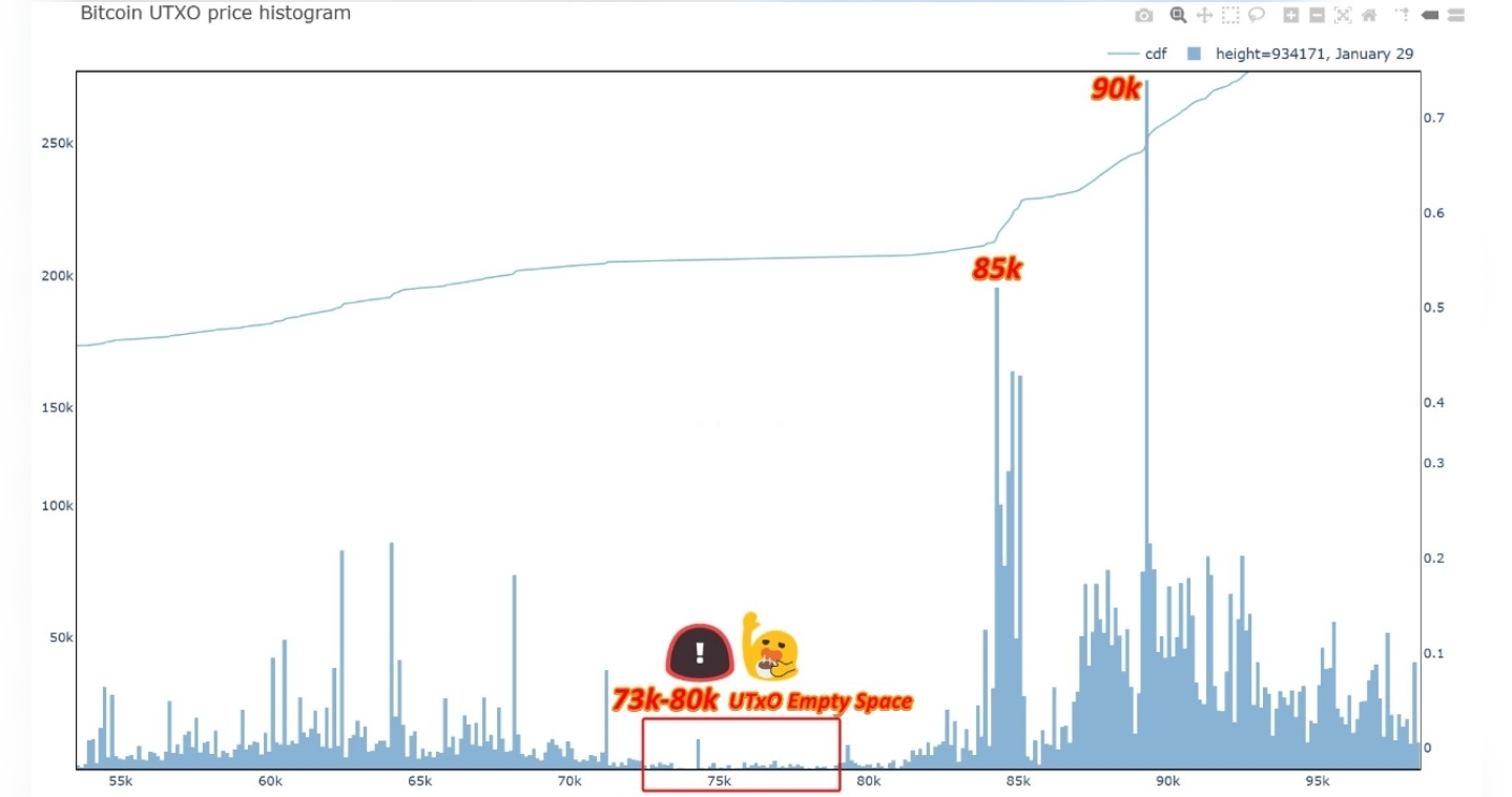 Outro indicador on-chain apontando para uma lacuna entre $73.000 e $80.000 é o histograma de preços de Saídas de Transação Não Gastas (UTXO). Como cada transação de Bitcoin utiliza UTXOs existentes e cria novos, os UTXOs refletem a atividade on-chain. O gráfico mostra baixa densidade de UTXOs nessa faixa, significando que poucas transações ocorreram lá. Como resultado, os investidores não construíram uma base de custo sólida para suportar os preços, que agora caíram abaixo de $80.000.