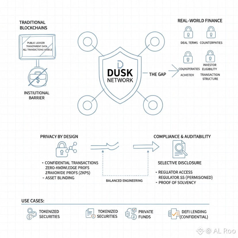 Most chains are built like public billboards. Every move, every balance change, every interaction gets written in a way that anyone can read forever. That works for simple assets, but it breaks the moment you try to copy how financial markets actually operate. In real markets, confidentiality isn’t optional. Deal terms are private. Counterparties are private. Investor eligibility is private. Even the structure of a transaction can be sensitive. If you expose all of that on a public ledger, you don’t get “transparent finance,” you get a system that institutions cannot touch.