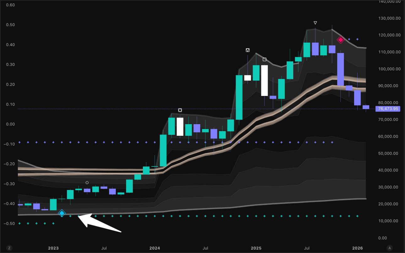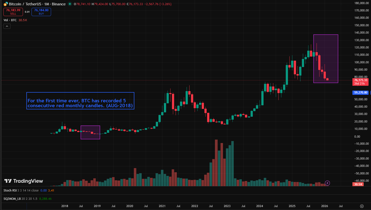 Na história inteira do Bitcoin, imprimir quatro velas vermelhas mensais consecutivas é um evento extremamente raro e de baixa. A última vez que vimos esse padrão específico foi em agosto de 2018.
