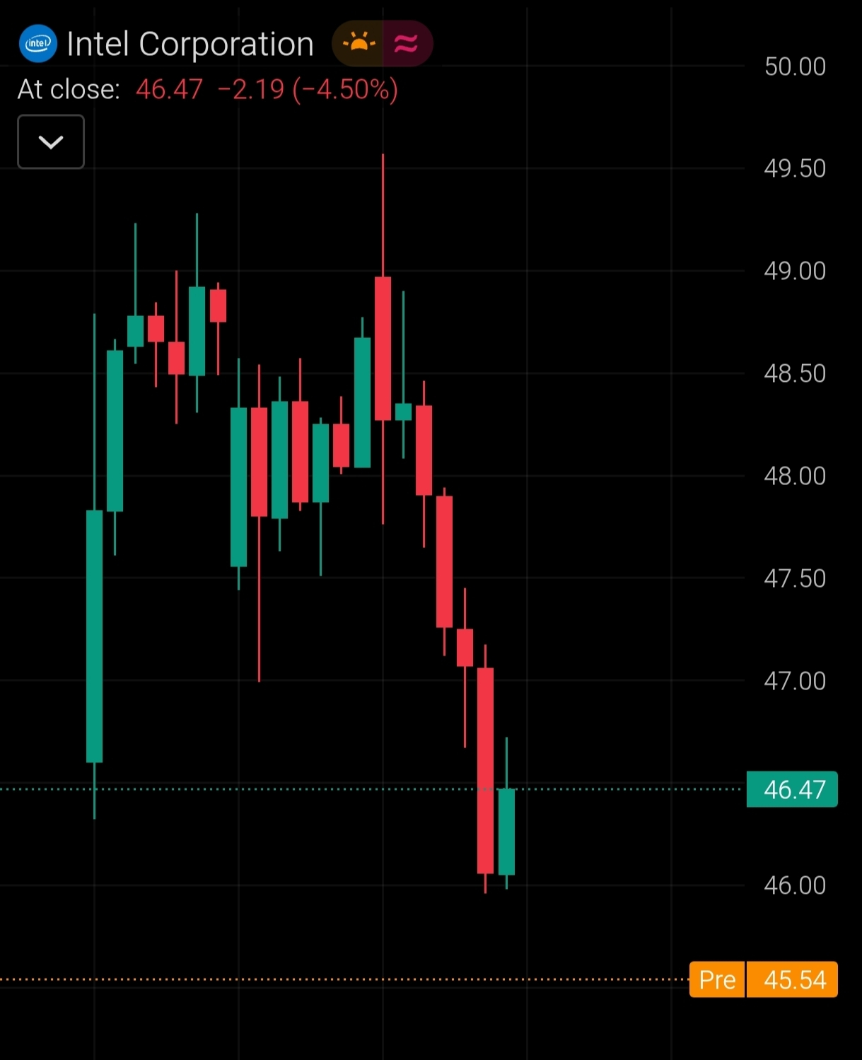 Isso mesmo. Agora você pode negociar a Intel Corporation, uma das maiores gigantes de semicondutores do mundo, diretamente na Binance com alavancagem. A ação acabou de fechar a $46,47, caindo mais de 4% no dia.