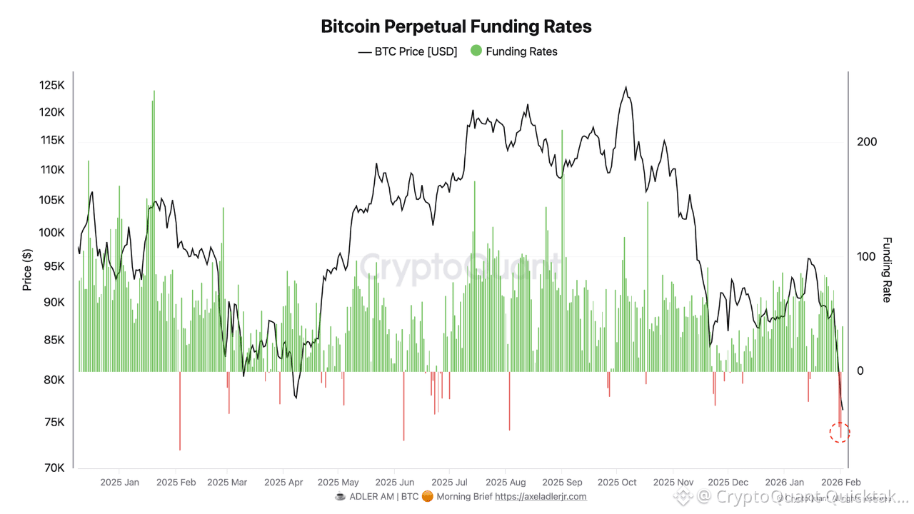 Após o colapso do mercado de domingo, o mercado de derivativos do Bitcoin enviou um sinal importante: as taxas de financiamento perpétuas rapidamente se tornaram negativas. Isso reflete uma fase de desalavancagem agressiva, onde a balança de pagamentos muda temporariamente a favor dos comprados, tornando mais caro manter as posições vendidas. Nesse contexto, o financiamento negativo indica não uma mudança no regime de mercado, mas sim um processo de liquidação forçada de posições sobre-alavancadas.