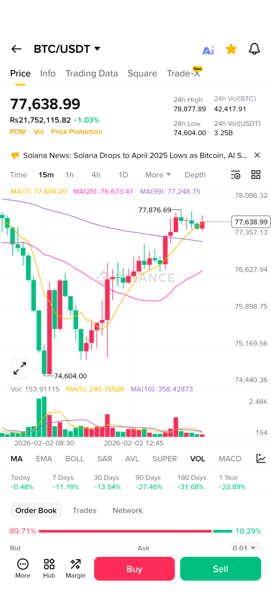 O BTC está em torno de ~$77.000 USD hoje. Isso reflete um movimento para baixo em vez de um grande aumento.