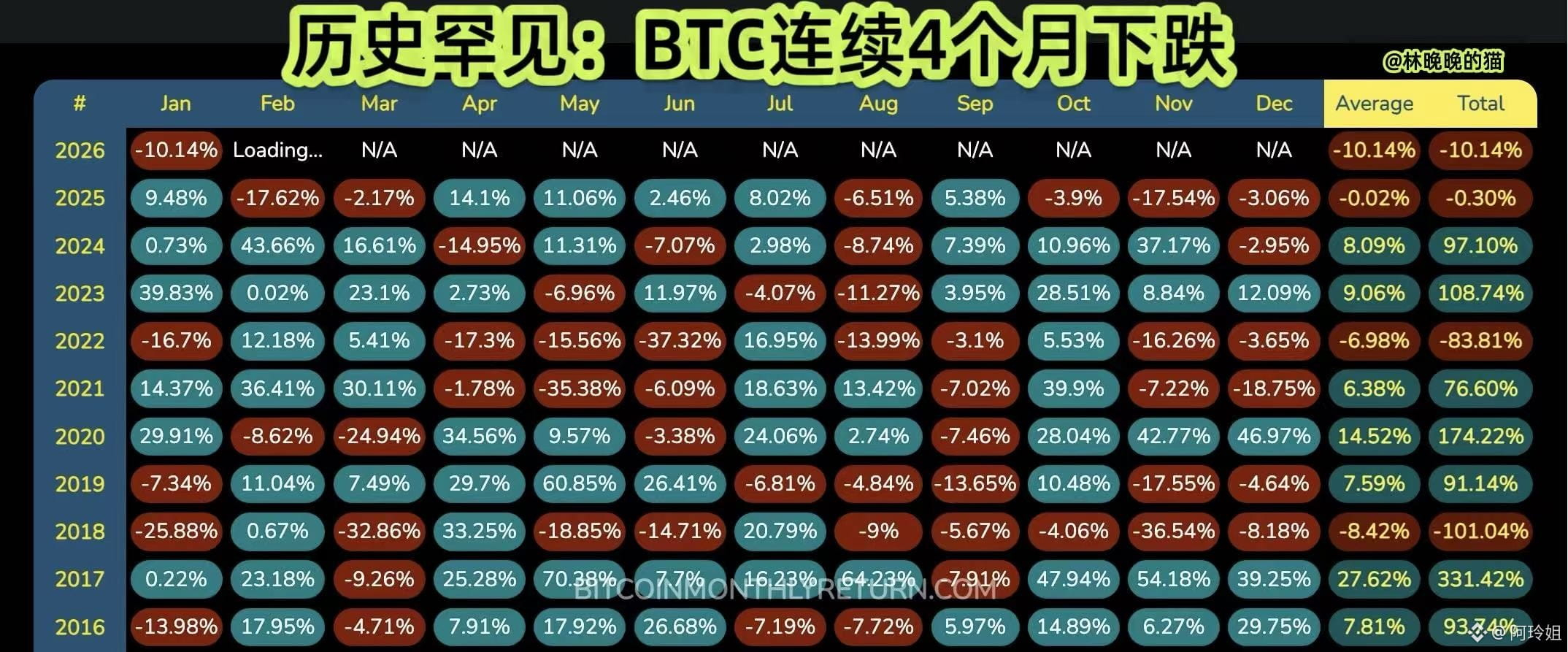 查了下,BTC从去年10月ATH以来,10月、11月、12月、1月连续四个月收跌。