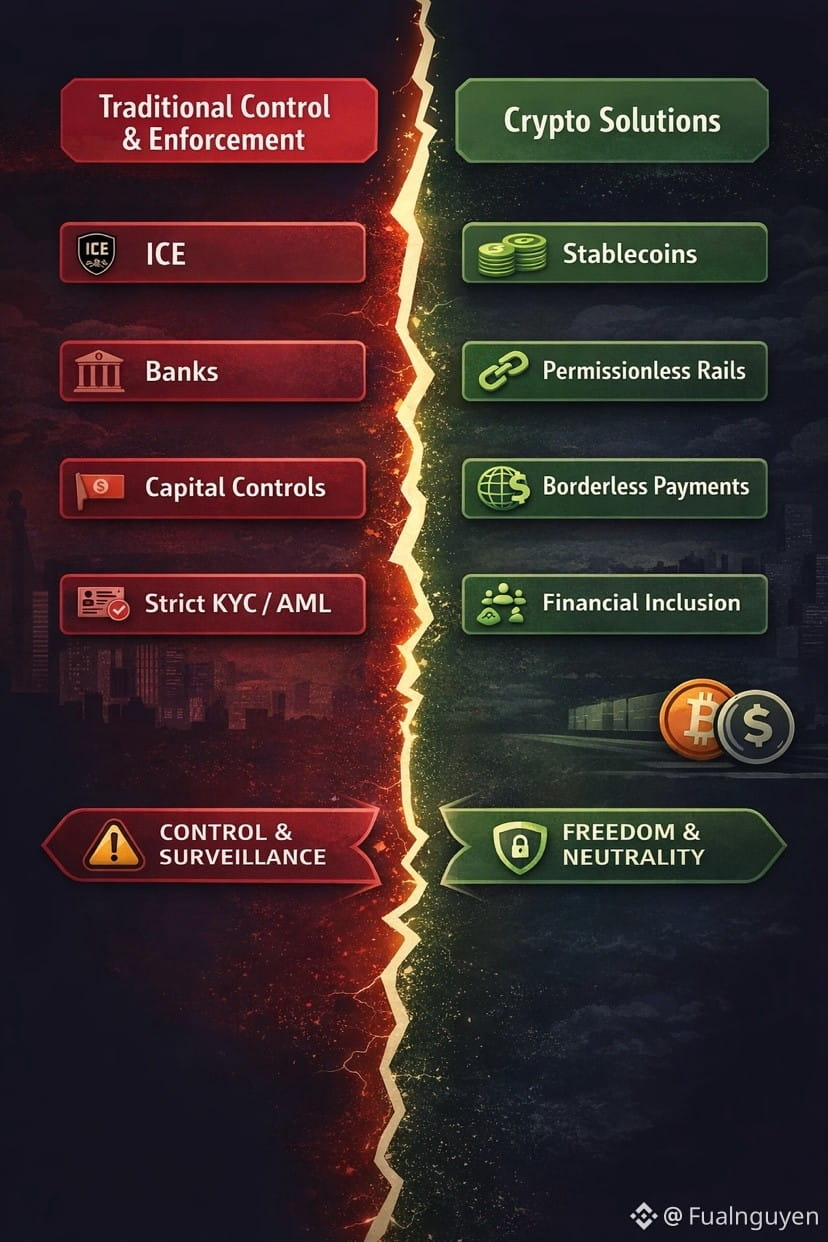 As trust in institutions weakens, societies naturally begin to search for systems that feel neutral, permissionless, and independent of identity, nationality, or formal approval. This is where crypto enters the picture, not as an ideology, but as infrastructure. Bitcoin, stablecoins, and blockchain-based payment rails do not ask who you are, where you come from, or whether you are authorized. They simply execute. That neutrality is not political by design, but it becomes especially attractive during periods of political and social tension.