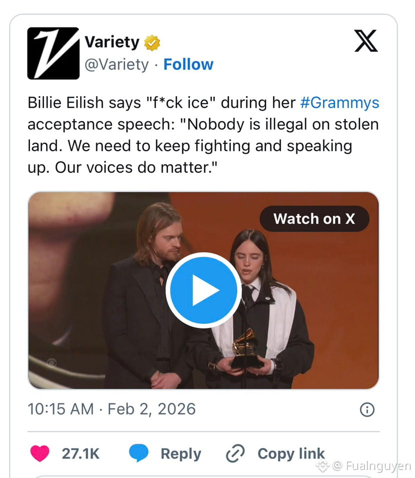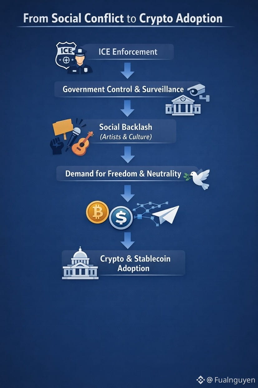 At first glance, artists speaking out against ICE at the Grammy Awards appears completely unrelated to crypto, stablecoins, or Bitcoin. But beneath the surface, these events belong to the same structural narrative: how societies respond to control, and how neutral financial infrastructure emerges as a consequence. Crypto does not grow in calm environments.It grows where social friction exists.