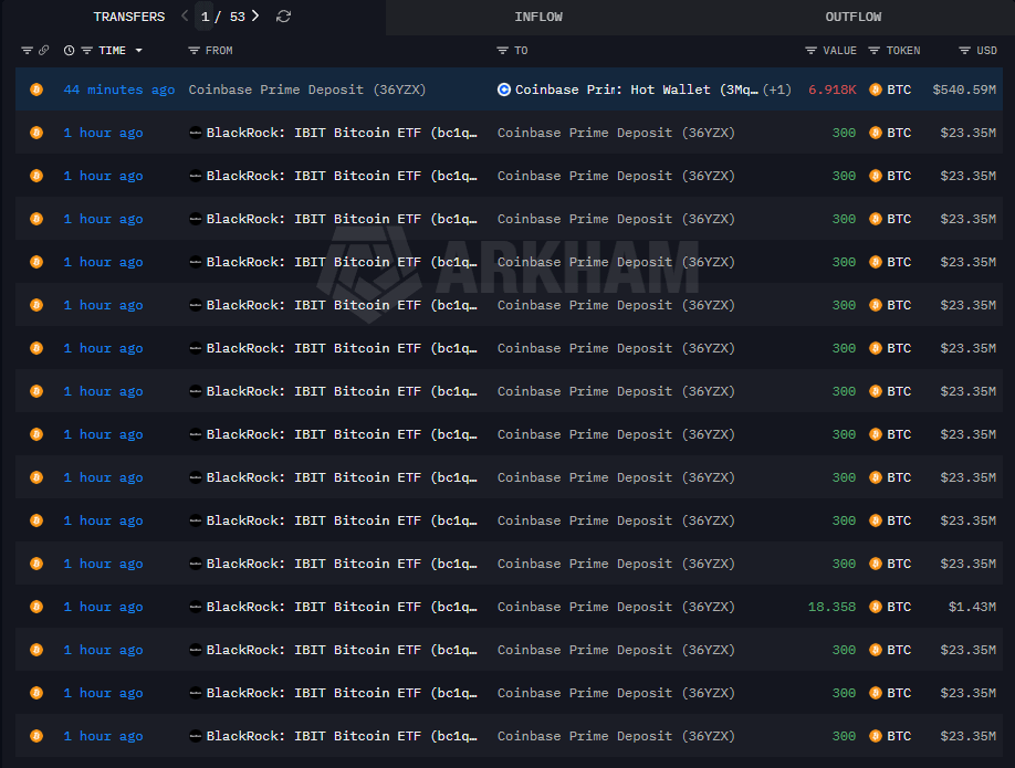 Chỉ trong ~1 giờ, ví liên quan BlackRock – IBIT Bitcoin ETF liên tục chuyển 300 BTC/lần vào Coinbase Prime Deposit.