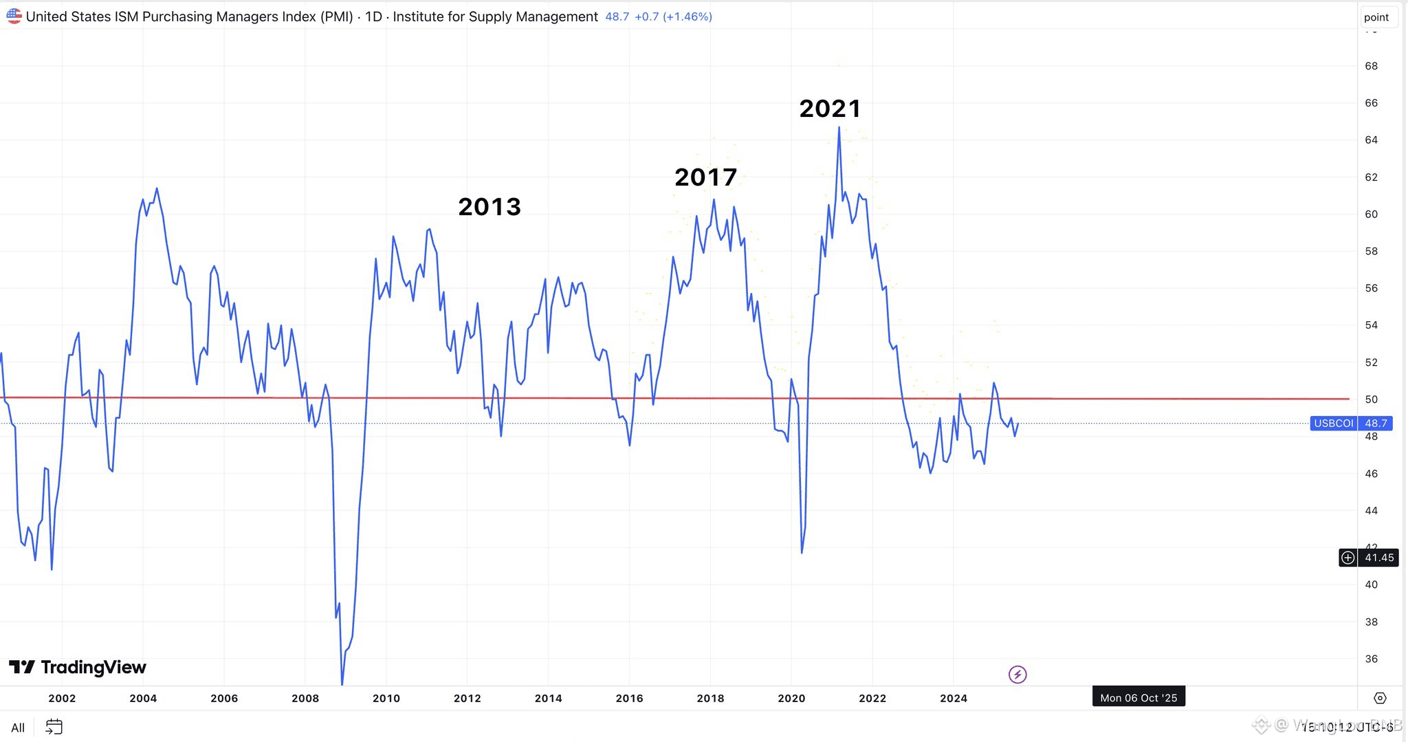 Every major bull run 2013, 2017, 2021 began only after the ISM Manufacturing Index moved above 50.