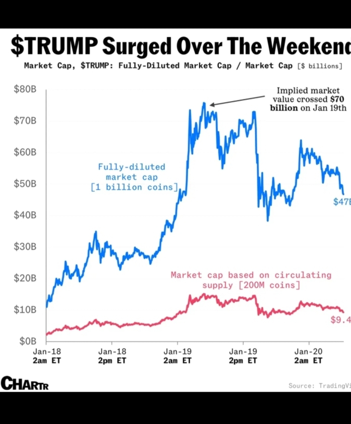 A história inicial do gráfico mostra um rápido aumento no lançamento, impulsionado por hype e associação política, com preços subindo para $70+ em janeiro de 2025.