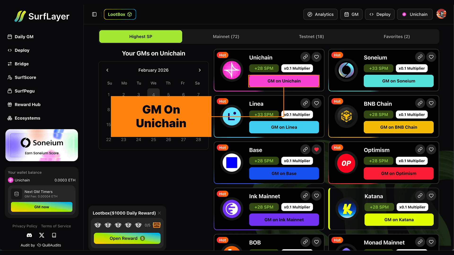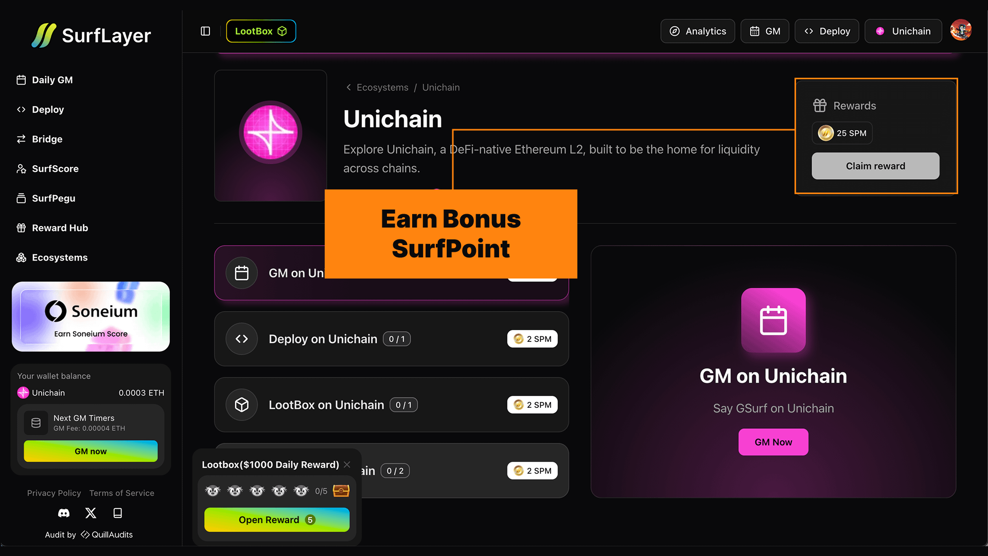 Ao combinar interações de baixo custo, ferramentas claras e mecanismos de recompensa transparentes, o SurfLayer ajuda os usuários a construir uma identidade on-chain credível na Unichain — uma ação de cada vez.
