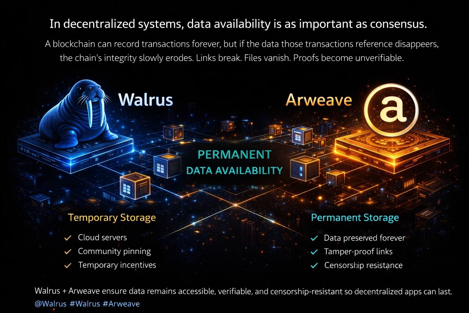 Walrus aborda isso ao emparelhar a disponibilidade de dados estruturados com a permanência do Arweave. O resultado é um sistema onde os dados não apenas existem — eles permanecem acessíveis, verificáveis e resistentes à censura ao longo do tempo.