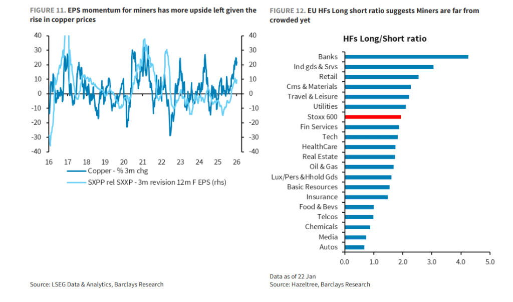 ○ Bancos como o Barclays alertam que, durante um ciclo de alta do ouro, as ações de mineração de ouro geralmente apresentam maior elasticidade de preço. Atualmente, o aumento no preço das ações das mineradoras pode ainda não refletir completamente as expectativas de crescimento dos lucros por ação (EPS) trazidas pela alta do preço do ouro. Uma vez que o preço do ouro termine sua correção e retome a tendência de alta, as ações de mineração podem experimentar um notável rali de recuperação, oferecendo aos investidores uma alternativa de investimento de alta beta além do ouro físico e ETFs.