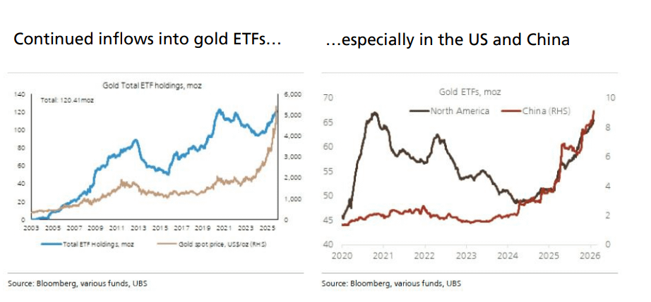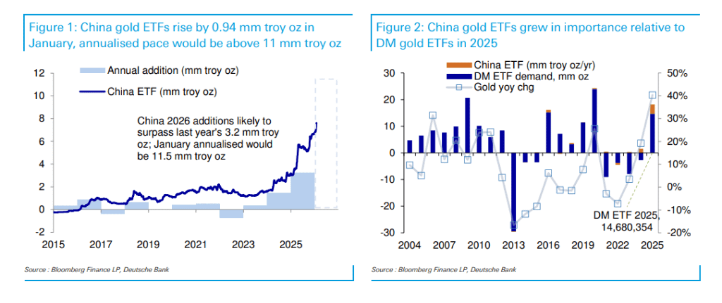 ○ Um relatório do Deutsche Bank revelou um dado chave: apenas em janeiro de 2026, a quantidade de ouro adquirida por ETFs na China foi de aproximadamente 940.000 onças. Se mantido esse ritmo, a aquisição anual pode atingir impressionantes 11.500.000 onças.