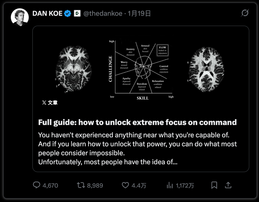 Dan Koe também escreveu sobre como liberar o potencial humano através do controle da atenção, mas ele é muito prolixo. Vou resumir em algumas palavras.