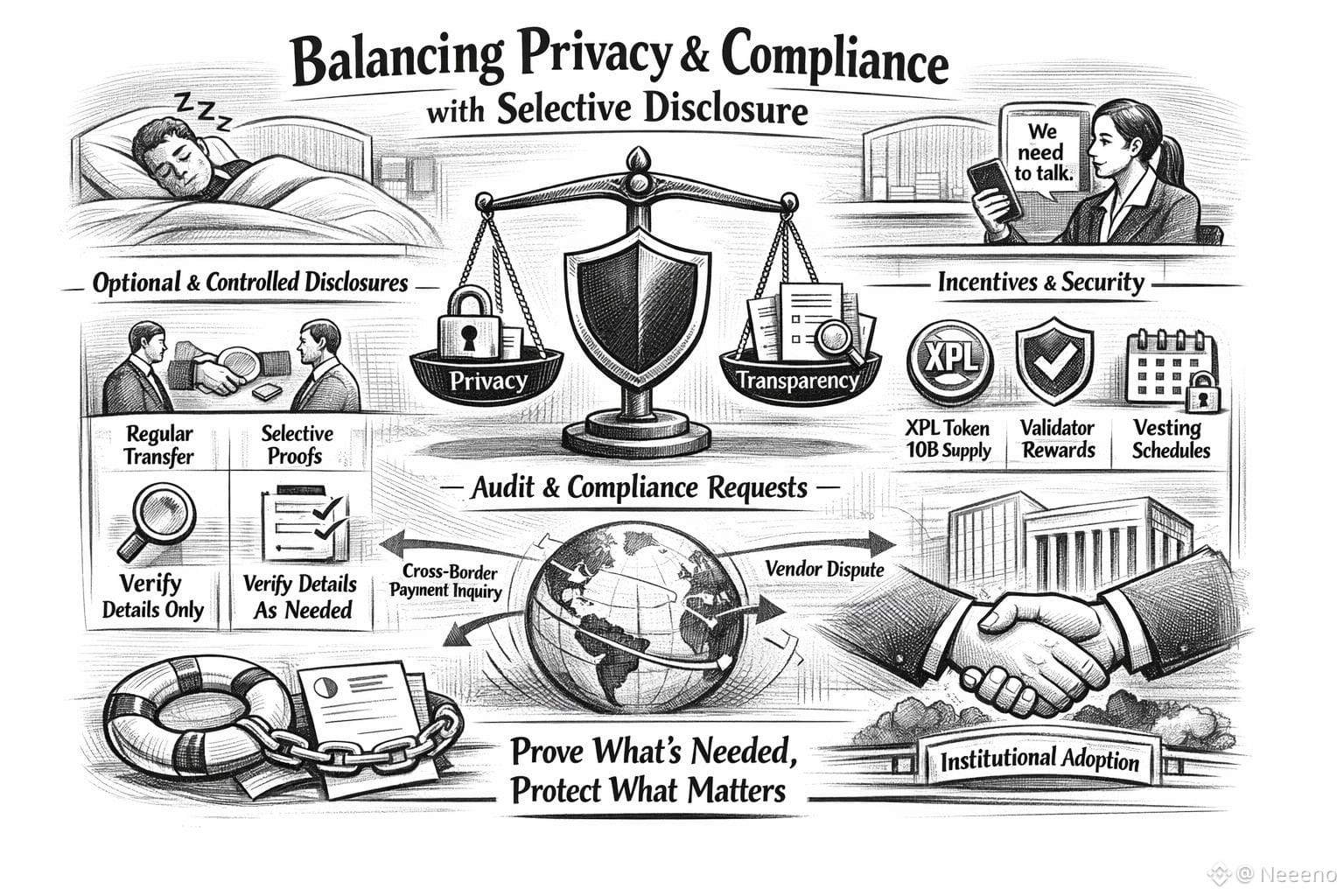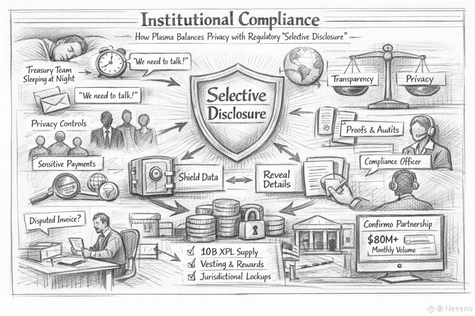 @Plasma The first thing people miss about compliance is that it isn’t a checkbox, it’s a mood. It’s the difference between a treasury team sleeping at night or waking up to a Slack message that begins with “we need to talk.” Plasma is being built in that emotional territory, where privacy isn’t a rebellious statement and transparency isn’t a virtue signal. It’s just the day-to-day reality of moving dollars through systems that have auditors, counterparties, sanctions lists, and human careers attached to them. When Plasma talks about selective disclosure, it’s admitting something most crypto products avoid saying out loud: the real world doesn’t want everything public, and it also doesn’t accept “trust me” as an answer.