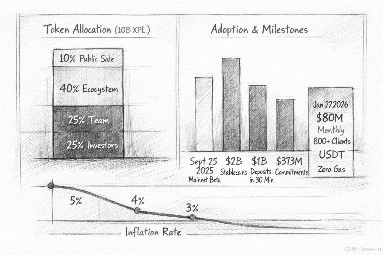 The other side of compliance is incentives, because policies are only as strong as the economic gravity beneath them. Plasma’s token, XPL, is positioned as the security anchor: an initial supply of 10,000,000,000 XPL at mainnet beta launch, with allocations that explicitly spell out who holds what and when those holdings become liquid. Ten percent—1,000,000,000 XPL—was allocated to the public sale, while 40% is reserved for ecosystem and growth, and 25% each to team and investors, with multi-year vesting mechanics. Those numbers aren’t just tokenomics trivia; they tell institutions whether the network’s incentives are likely to remain stable when the first real stress hits and people start reaching for liquidity.