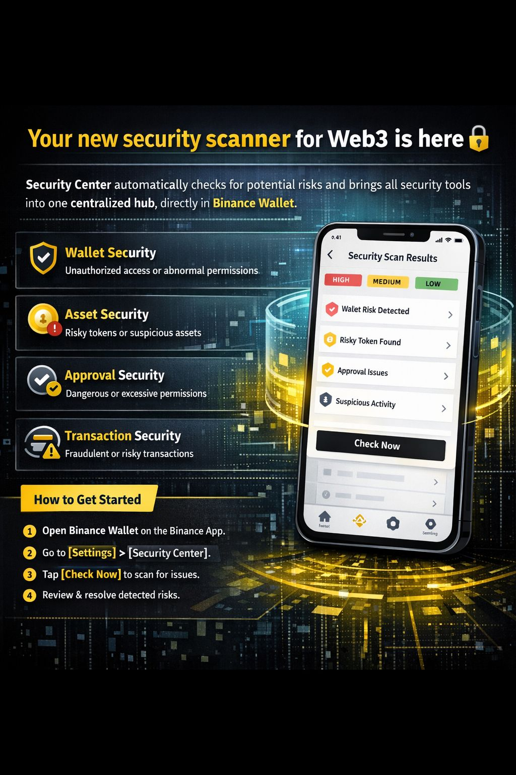 O Centro de Segurança verifica automaticamente riscos potenciais e reúne todas as ferramentas de segurança em um hub centralizado, diretamente na Binance Wallet.