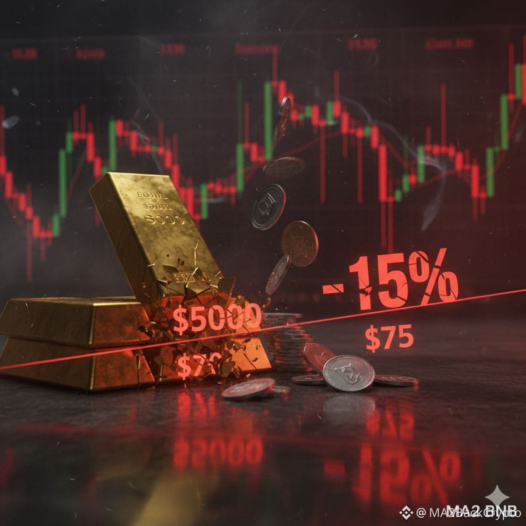 $BNB Acabou de acontecer: o ouro caiu abaixo de $5000 enquanto a prata despencou para menos de $75, caindo cerca de -15% em um dia. Os metais estão sob forte pressão, com vendas de pânico em todos os lugares. Esse tipo de movimento choca muitos traders, o mercado está eliminando alavancagens, causando uma dor de curto prazo grande, mas o ciclo sempre avança.