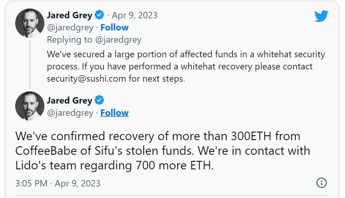 Horas após o incidente, Gray acessou o Twitter para anunciar que uma “grande parte dos fundos afetados” foi recuperada por meio de um processo de segurança whitehat. “Confirmamos a recuperação de mais de 300ETH de CoffeeBabe dos fundos roubados de Sifu. Estamos em contato com a equipe do Lido a respeito de mais 700 ETH.”