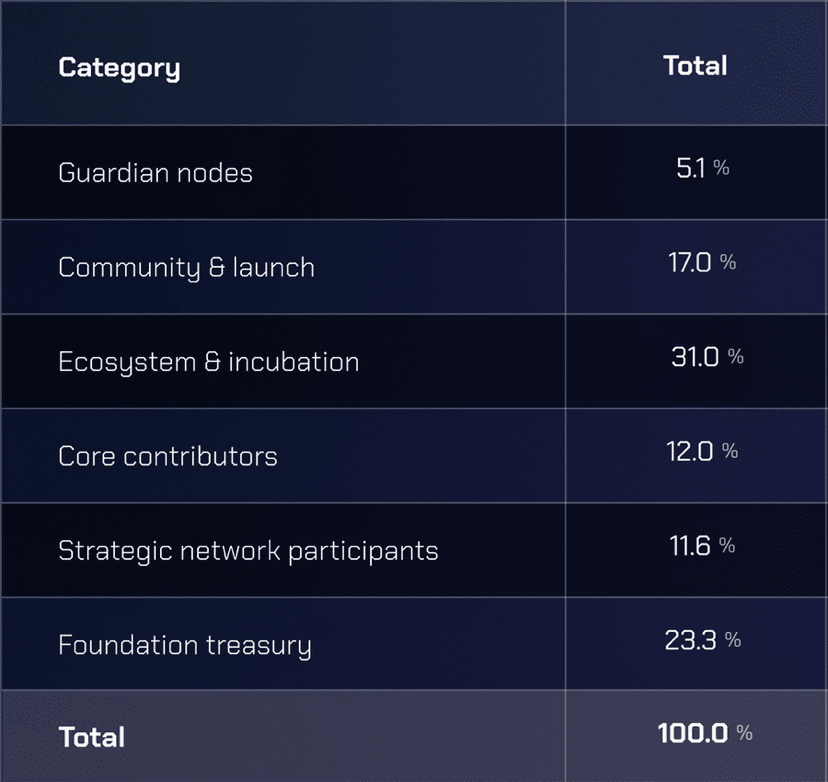 • 11% desbloqueados na TGE, distribuídos nas fases iniciais e lançamento aéreo.