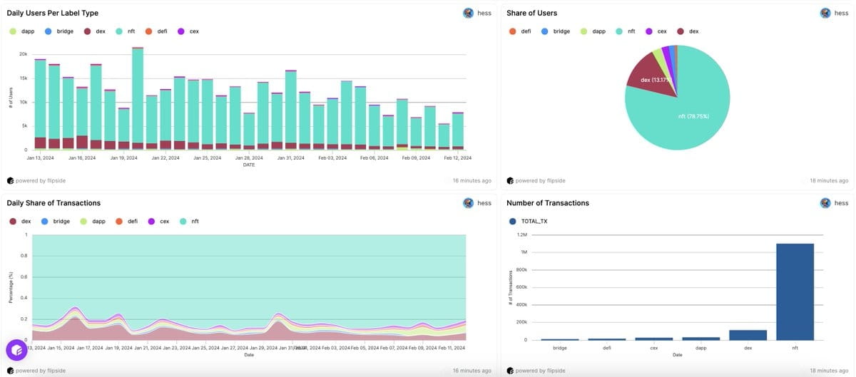 O envolvimento dos usuários na cadeia Sei girou predominantemente em torno de atividades NFT, captando o interesse de 78% da base de usuários. Além dos compromissos NFT, as bolsas descentralizadas (DEXs) foram os próximos locais de transação mais populares no último mês.