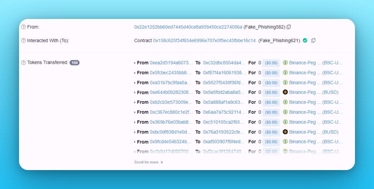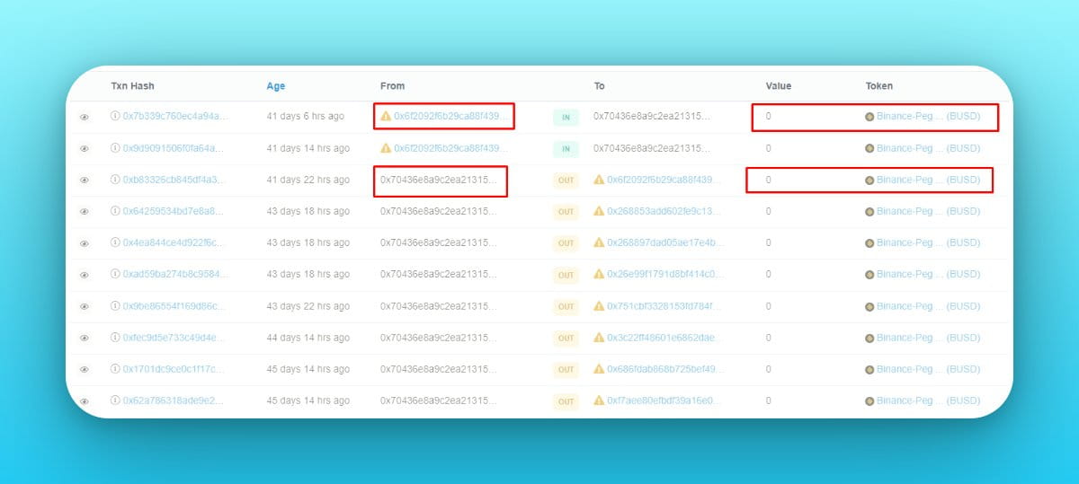 Os golpistas manipulam contratos inteligentes para fazer você enviar tokens para um endereço semelhante ao anterior.