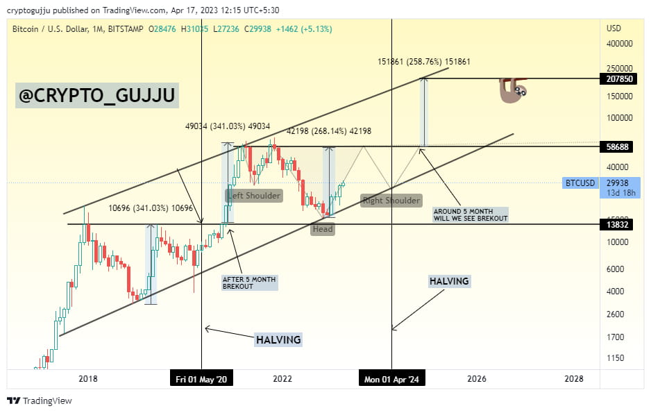 O último máximo histórico do mercado altista do Bitcoin foi de 69.000$, então o BTC sofreu uma forte queda até 15.480$, que foi aproximadamente 77% abaixo de seu máximo histórico. No atual cenário de mercado baixista de 2022, o Bitcoin testou um novo fundo de 15.480$, e muitos traders pensam que o BTC chegará a 10.000$ e o mercado provará que todos eles estão errados e recuará e atualmente atingirá a marca de 31.000$. de acordo comigo, seu movimento pré-halving..e nossa meta principal é 42.000$ e 48.000$ bcoz, há nível fib 0,5 e 0,61, mas também pode ser que o btc possa formar cabeça e ombro, se se formar, então o btc alcançará 60.000$ e então descartará para 30.000$, 50% cairá e o mercado sacudirá a mão fraca e, em seguida, o halving virá. Depois do halving, veremos uma corrida insan do BTC e esta meta de padrão clássico será de 180.000$ a 225.000$.