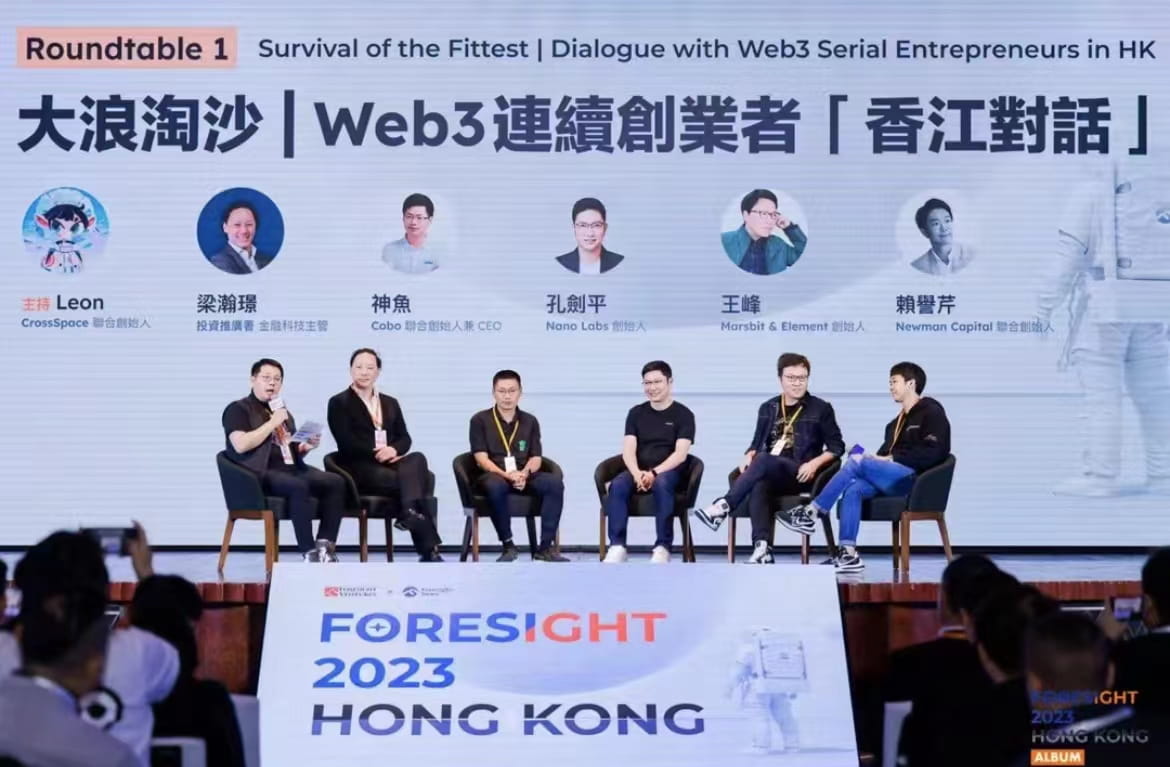 O cofundador e CEO da CrossSpace, Leon (1º à esquerda), sediou o Foresight 2023 Hong Kong em abril de 2023