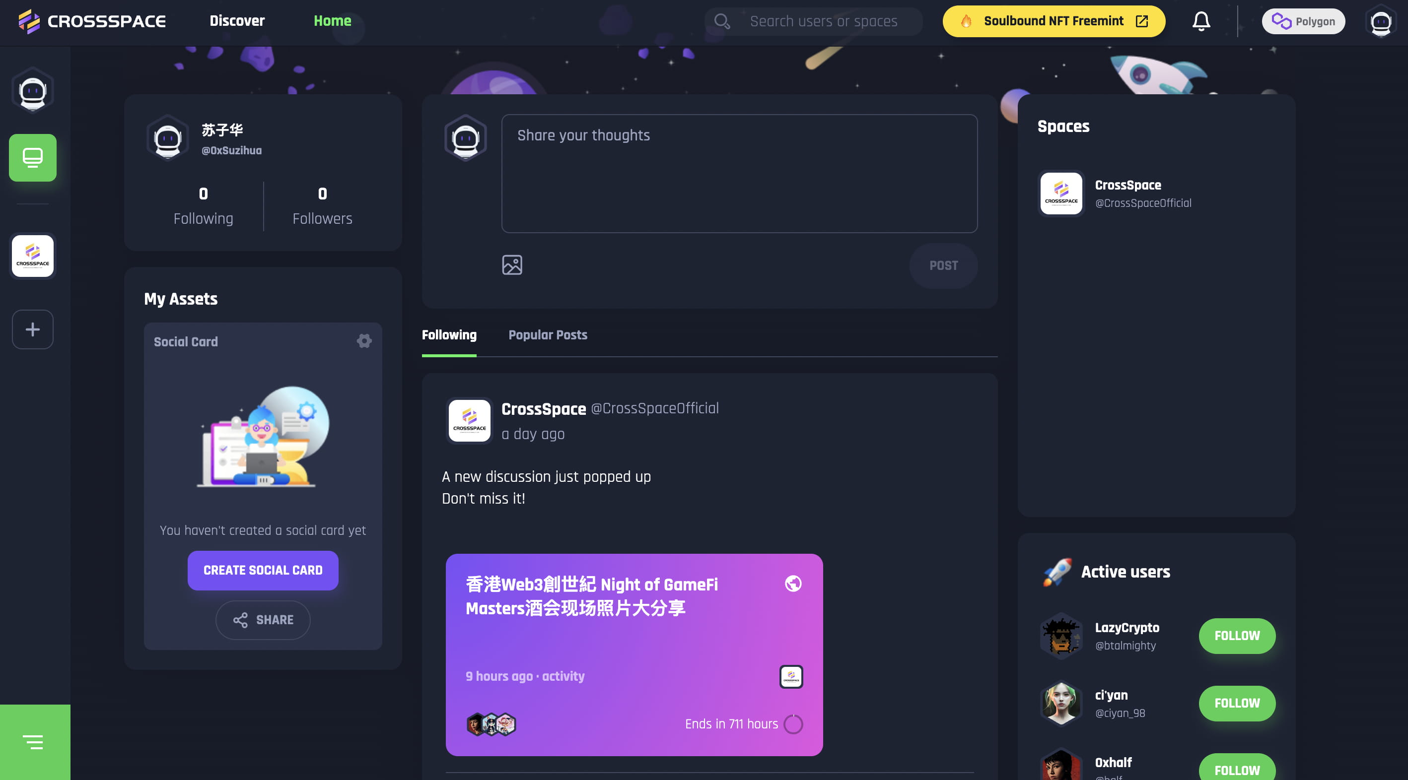 "Comparado à rede social de conhecidos da Web2 e à rede social de estranhos na mesma cidade, o campo da Web3 é uma rede social de estranhos voltada para negócios em escala global. O rápido desenvolvimento da tecnologia blockchain trouxe mudanças no lado da demanda, o que criou novas necessidades e oportunidades sociais. A CrossSpace combinará várias infraestruturas da Web3, combinará organicamente com diferentes cadeias públicas, auxiliará comunidades e indivíduos a concluir a transferência de valor suavemente e criar, distribuir e depositar ativos sociais na cadeia." Leon disse.