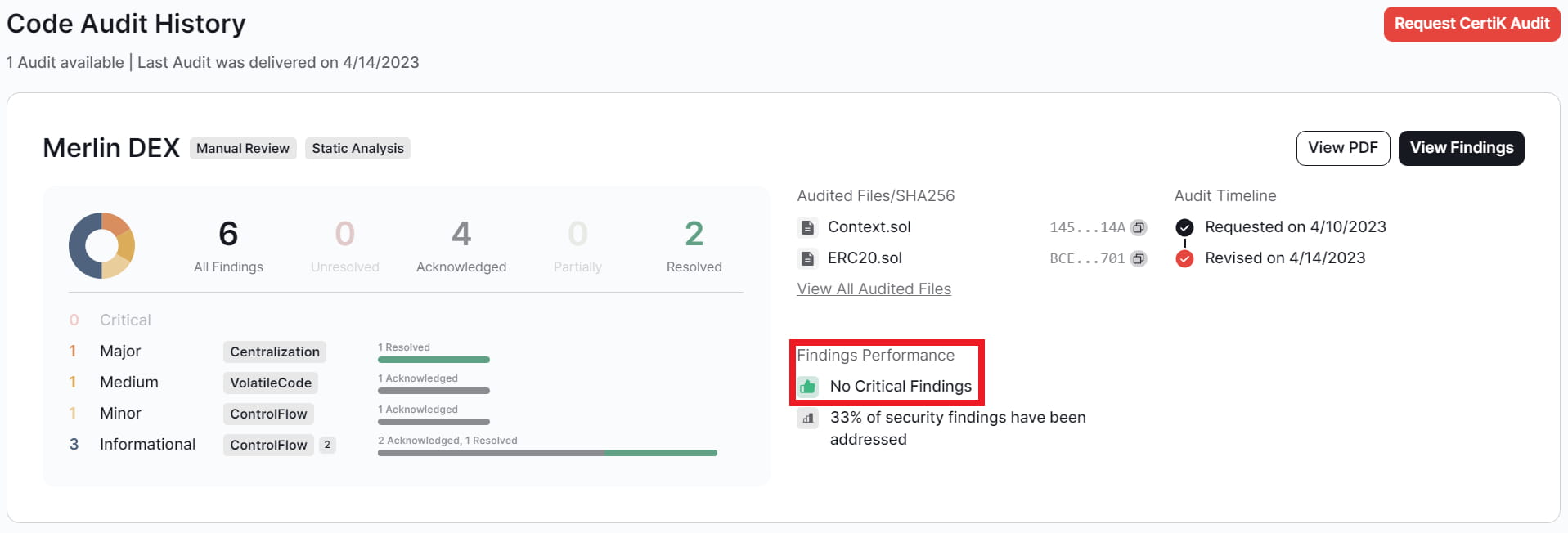 O hack do Merlin ocorreu apesar de um relatório de auditoria da CertiK que encontrou “Nenhuma descoberta crítica”. CertiK sugeriu que o hack poderia ser devido a um problema de gerenciamento de chave privada, e não a uma exploração, alegando que as auditorias não podem evitar tais problemas. A empresa também garantiu que compartilharia informações relevantes com as autoridades caso houvesse suspeita de crime.