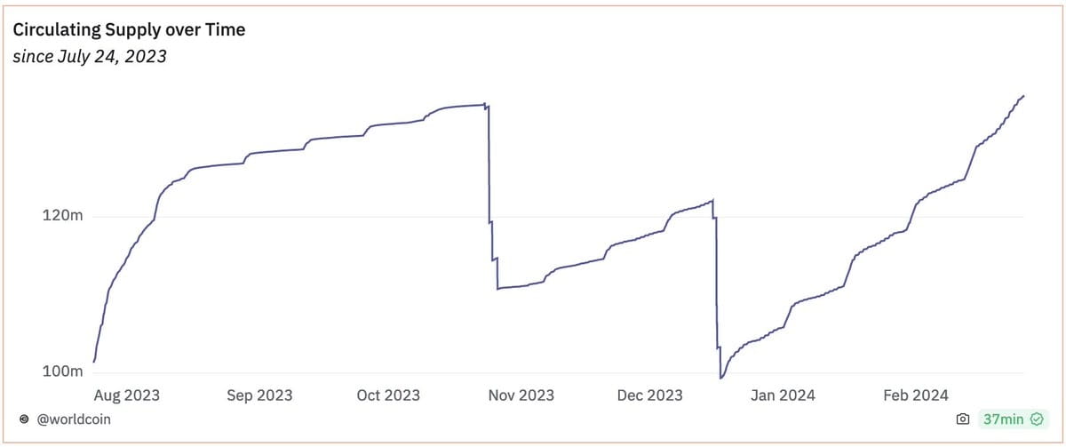 Os investidores estão de olho no evento de desbloqueio de julho, sem perceber que a Worldcoin está aumentando suas distribuições semanais de usuários. A partir desta semana, está distribuindo mais de 10 milhões de WLD (no valor de cerca de US$ 92 milhões) a cada duas semanas, com planos de aumentar essa taxa. No mês passado, a oferta circulante aumentou 25%, tendência que deverá continuar.