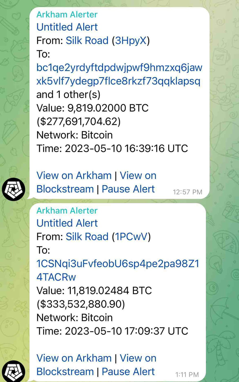 À noite, 9.800 BTC no valor de US$ 276 milhões saíram de uma carteira, e a conta do Twitter @1kbeetlejuice, analista de pesquisa do The Block, relatou esse movimento como uma saída da carteira controlada pelos EUA. Ele apoiou isso com capturas de tela do bot do Telegram vistas abaixo, mas sua marcação estava errada. Após a notificação, foi registrado um recuo no preço do Bitcoin superior a US$ 1.000.