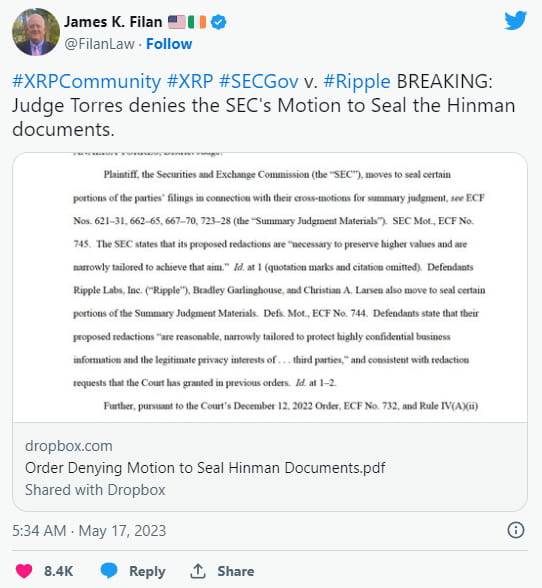James K. Filan compartilhou esse desenvolvimento. Ele é um advogado experiente que tem acompanhado de perto o processo entre a SEC e a Ripple.