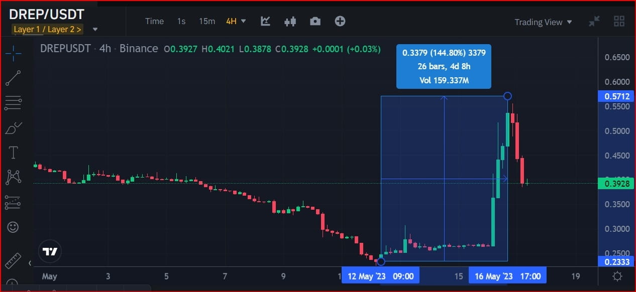 E finalmente, no dia 12 de MAIO de 2023, o par DREP/USDT CRYPTOCURRENCY saltou 144%, sendo negociado de $0,2333 para $0,5712 em 4 dias e 8 horas. E a maioria dos membros da nossa Comunidade de Crypto Trading transformou $500 em mais de $1.000 em 4 dias e 8 horas.