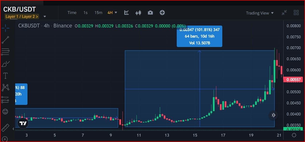 E a seguir, no dia 10 de FEVEREIRO de 2023, o par CKB/USDT CRYPTOCURRENCY saltou 101%, sendo negociado de $ 0,00341 para $ 0,00688 em 10 dias. E a maioria dos membros da nossa Comunidade de Crypto Trading transformou $ 500 em mais de $ 1.000 em 10 dias.